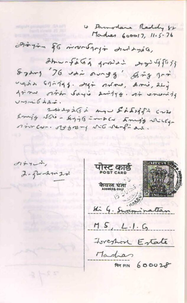எனது முதல் சிறுகதை தொகுப்பு ‘ஜ்வாலை’க்கு இரண்டு நன்றியுரைகளாக முகமன் வைத்தேன். ஒன்று நான் வேலை செய்த ஆராய்ச்சி நிறுவனத்தின் இயக்குனர் திரு ஜி. தியாகராஜன் எனக்கு பிரத்தியேகமாக அனுப்பிய பாராட்டு கடிதத்தையும் (‘கல்கி சிறுகதைப் போட்டியில் ஆறுதல் பரிசு பெற்ற சிறுகதை ‘மாயமான் வேட்டை’) அசோகமித்திரனின் அந்த தபால் அட்டை வாழ்த்தையும்தான். ஓர் அசாதாரண ஒற்றுமை. இருவர் பெயரும் தியாகராஜன்.